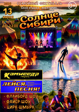 Семейный фестиваль «Солнце Сибири» Дата: 13 июня 2026 года Место: База отдыха «Акватория», Заводоуковский район, Тюменская область.